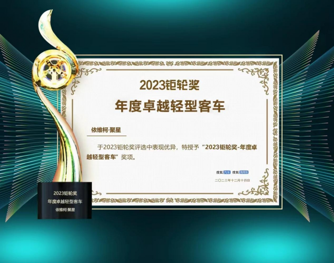 12月14日,第三届搜狐商用车新视界论坛暨2023钜轮奖颁奖盛典隆重举行。“鉅轮奖”是搜狐汽车与搜狐商用车共同主办,由门户网站推出的首个面向商用车行业的年度大奖,用以表彰在过去一年中不断追求进步、努力引领行业的商用车企业和产品,具有重要的影响力和强大的传播力。本次依维柯聚星能够从众多企业中脱颖而出,摘得“2023钜轮奖·年度卓越轻型客车”大奖,充分表明了行业与用户对依维柯聚星产品和实力的肯定与赞誉。